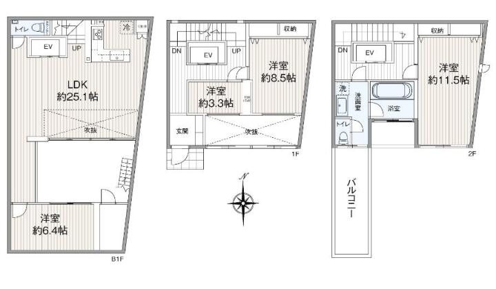| 備考 | その他設備 ・インナーコート(約1.26m²) ・機械室(約3.50m²) ・バルコニー(別途10.06m²) 間取り B1F:洋室約6.4帖 1F:LDK約25.1帖、洋室約3.3帖、洋室約8.5帖 2F:洋室約11.5帖 |