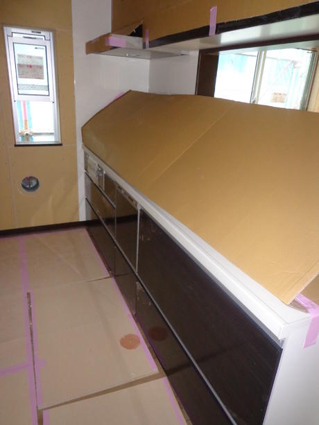 キッチンが今週入り、まだ養生がして有る状態ですが、大型のワイドキッチンが確認出来るようになっております!